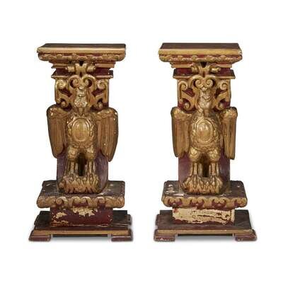 A PAIR OF MEXICAN PARCEL-GILT AND RED PAINTED EAGLE-FORM PEDESTALS 18th century