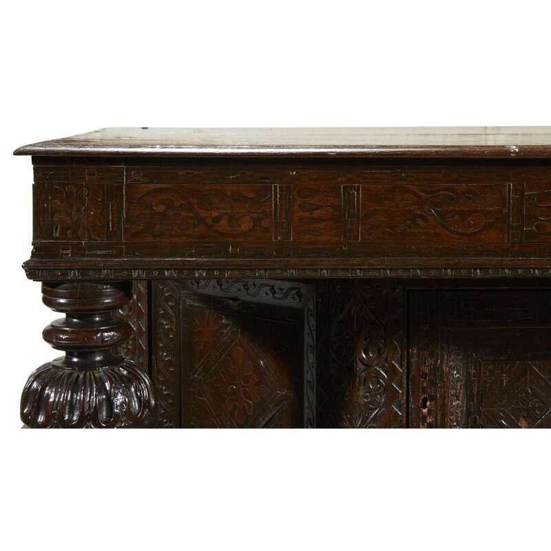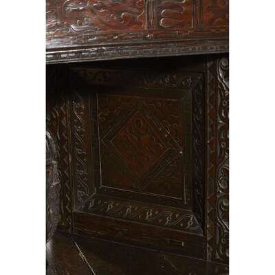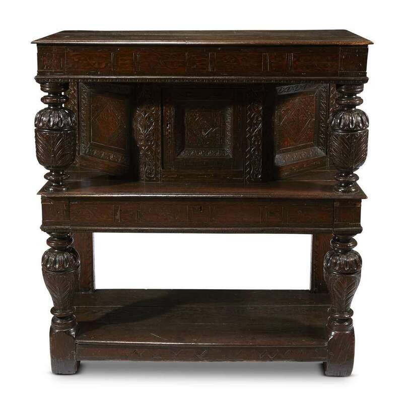 A LATE ELIZABETHAN MARQUETRY OAK LIVERY CUPBOARD late 16th century