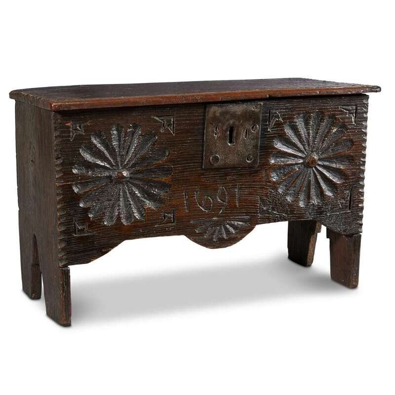 AN ENGLISH IRON-MOUNTED OAK MINIATURE DOWER CHEST dated 1691