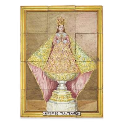 A SET OF TWELVE MEXICAN TIN-GLAZED EARTHENWARE TILES DEPICTING A DRESSED STATUE OF THE VIRGIN MARY early 20th century