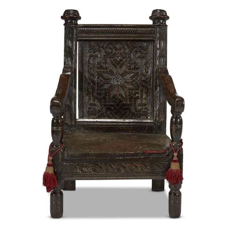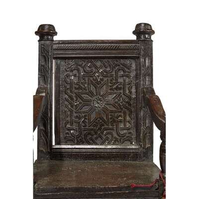 A JAMES I CARVED OAK LOW WAINSCOT CHAIR early 17th century