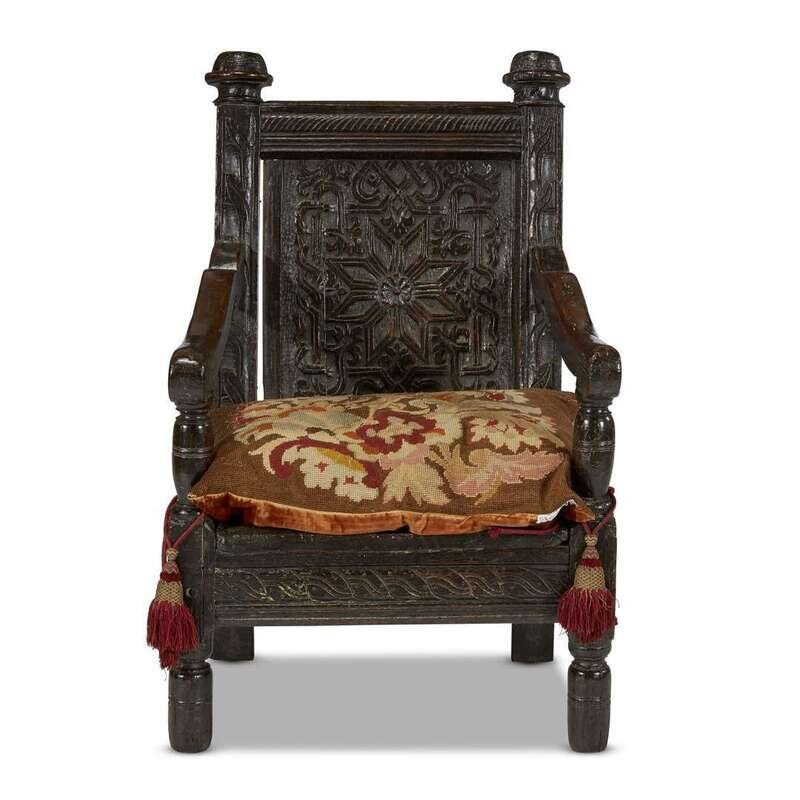 With elaborately carved stylized floral backrest, sold together with later grospoint cushion.