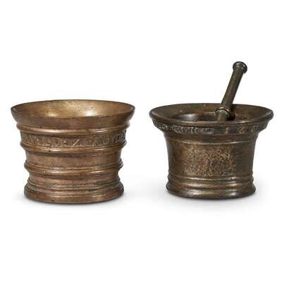 TWO SPANISH CAST BRONZE MORTARS WITH LETTERING one dated 1603, the other likely of similar date