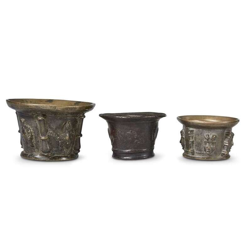 THREE SPANISH CAST BRONZE MORTARS WITH MASQUE AND FLANGE DECORATION 17th century