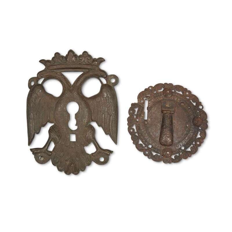 A SPANISH IRON LOCK PLATE AND ESCUTCHEON 17th/18th century