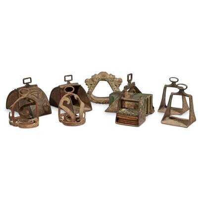 Comprising three pairs of stirrups and two individual stirrups with sets of Rudyard Kipling books; sold together with a single Mexican iron-mounted wood stirrup. (9).
