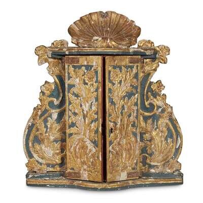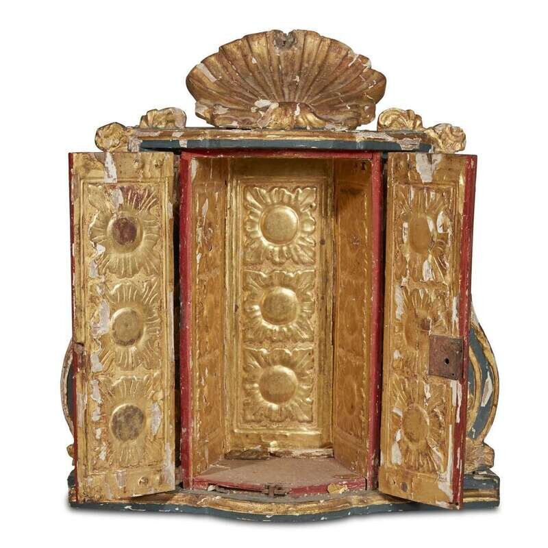 A SPANISH BAROQUE GREEN-PAINTED ANDPARCEL-GILT TRAVELING ALTAR 18th century