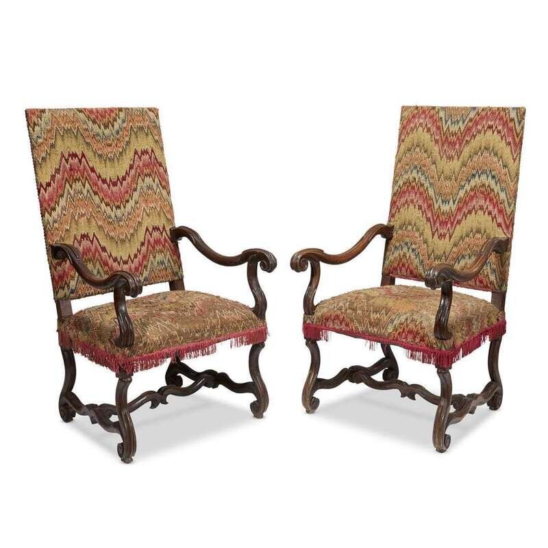 A PAIR OF SPANISH BAROQUE WALNUT ARMCHAIRS WITH FLAME STITCH UPHOLSTERY late 17th/early 18th century
