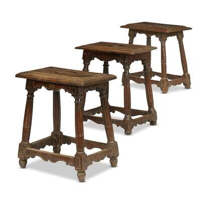 THREE SPANISH BAROQUE WALNUT JOINED STOOLS 17th/18th century