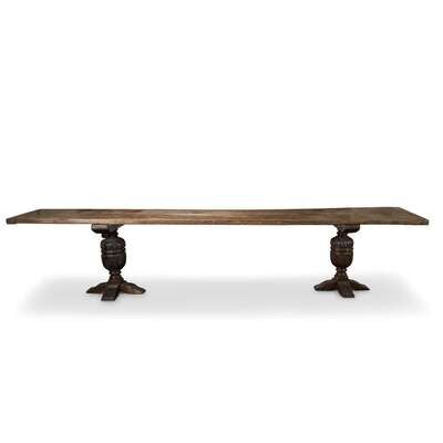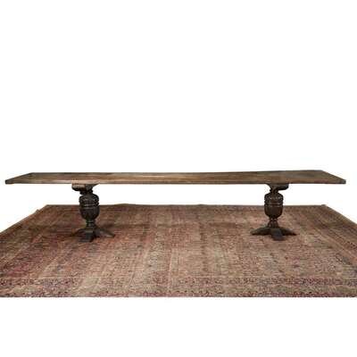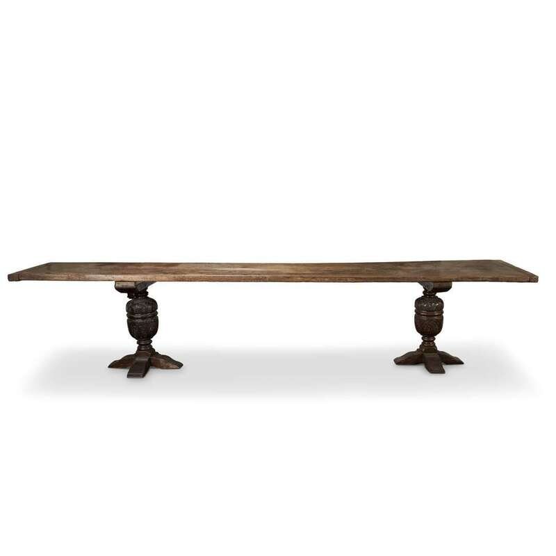 Possibly associated, the single plank elm top raised on two carved oak pedestals.