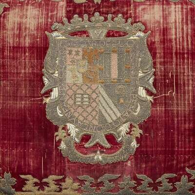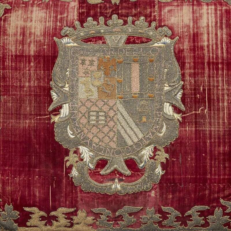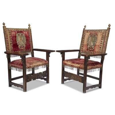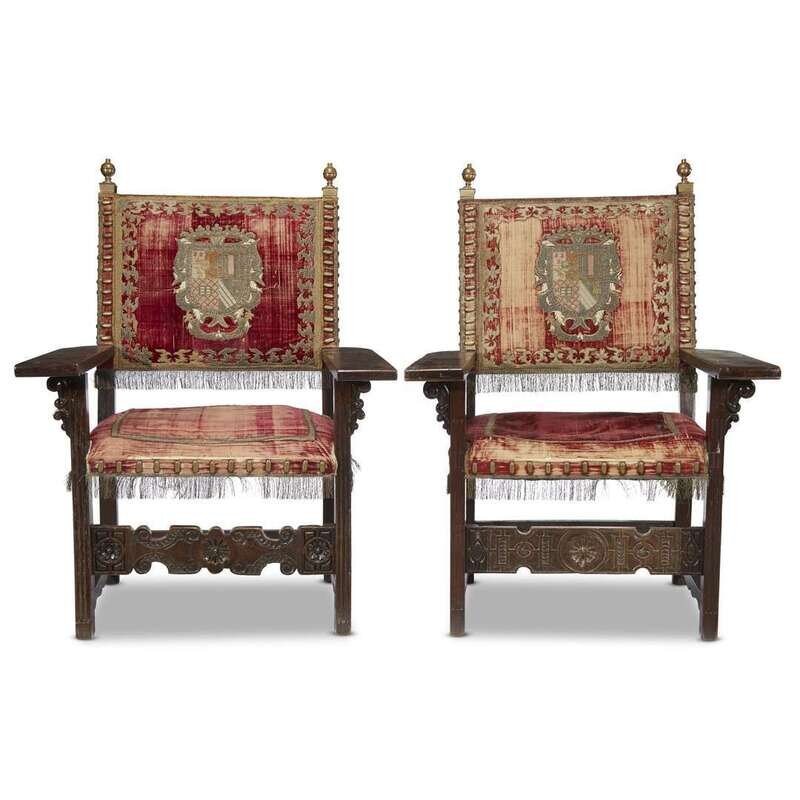 Each with crimson velvet upholstery applied with fine silverwork, the backrests centering silk and silver embroidered unidentified arms. (2).