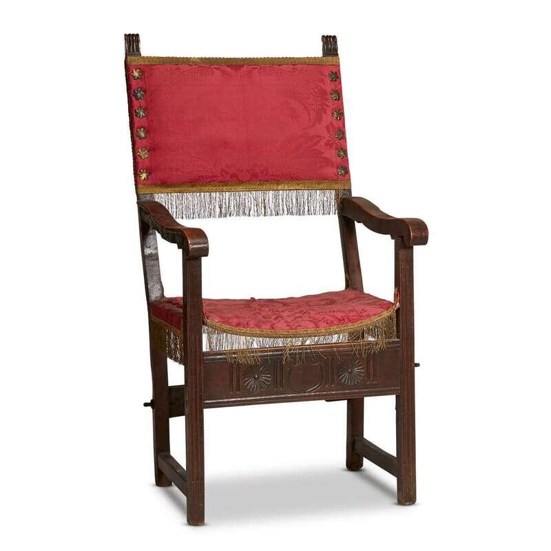 A SPANISH CARVED WALNUT MONK'S CHAIR WITH SILK DAMASK UPHOLSTERY 18th century with later restorations