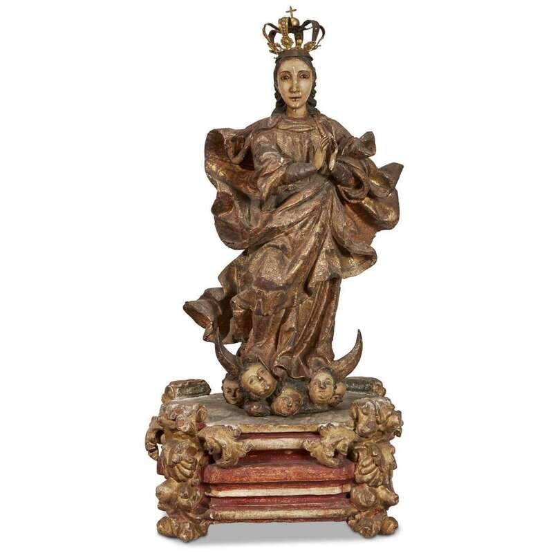 A SPANISH GILT AND POLYCHROME GESSO AND CARVED WOOD FIGURE OF THE VIRGIN OF THE IMMACULATE CONCEPTION 18th century