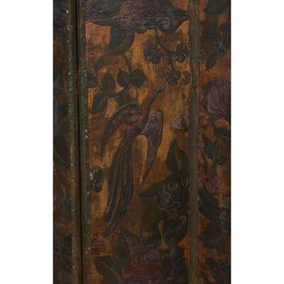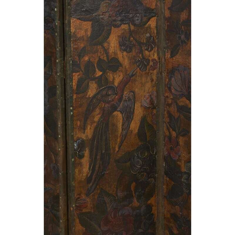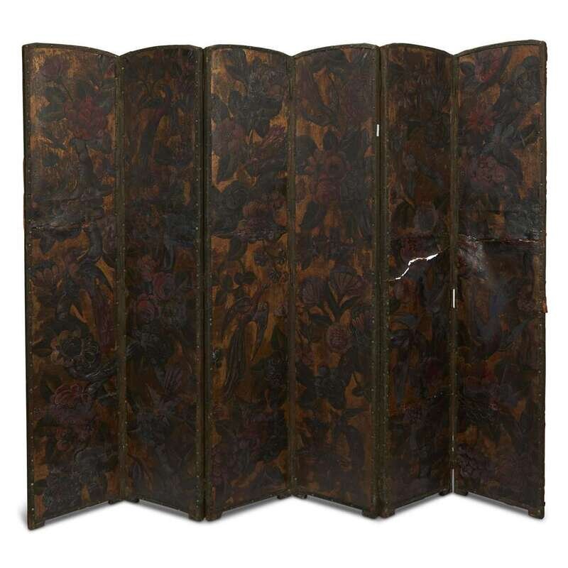 A SPANISH OR SPANISH COLONIAL GILT AND POLYCHROME CORDOVAN LEATHER SIX-PANEL FLOOR SCREEN WITH BIRDS AND FLOWERS the leather 17th/18th century