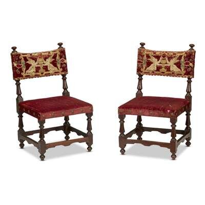 A PAIR OF SPANISH TURNED WALNUT CHILDREN'S CHAIRS WITH SILK VELVET UPHOLSTERY 17th century or later