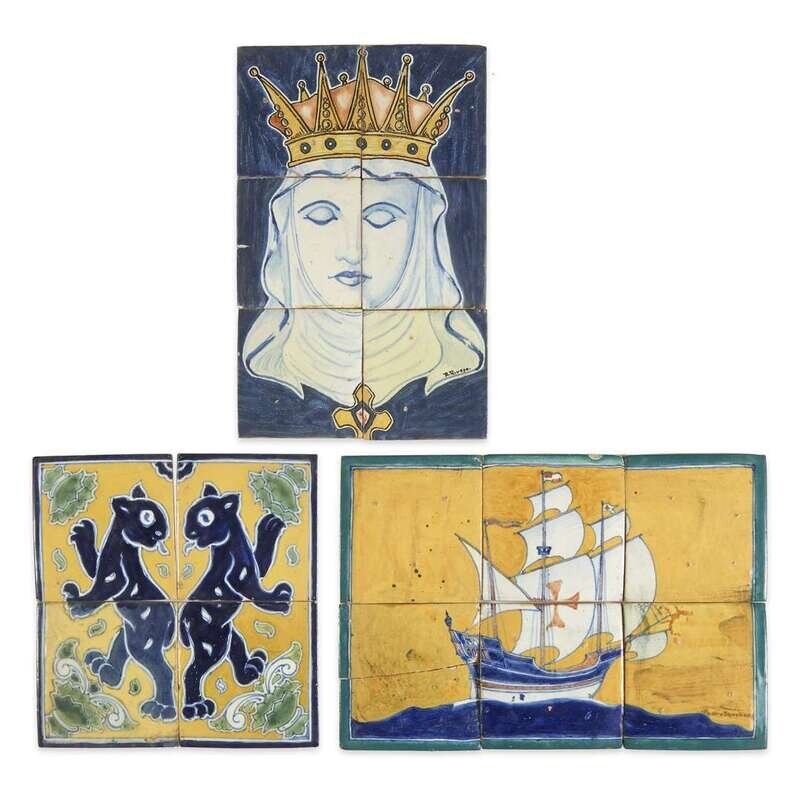 The first depicting jaguars; the second depicting the Virgin Mary signed "R. Rivero;" the third depicting the carrack Santa Maria and signed "Pedro Sanchez."