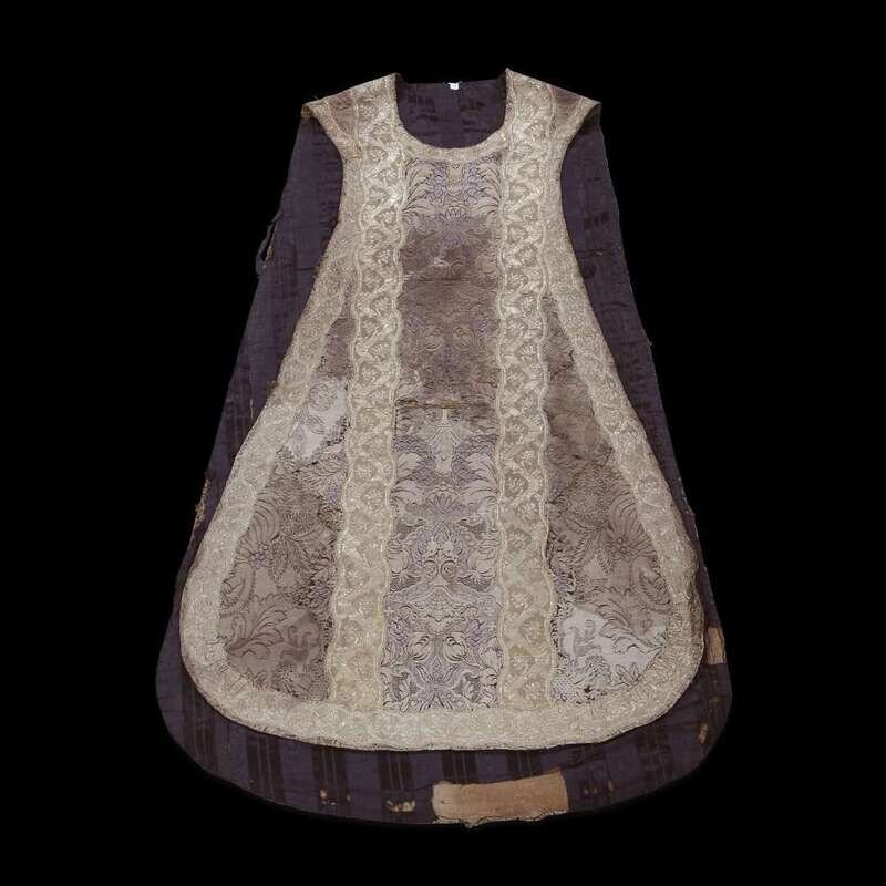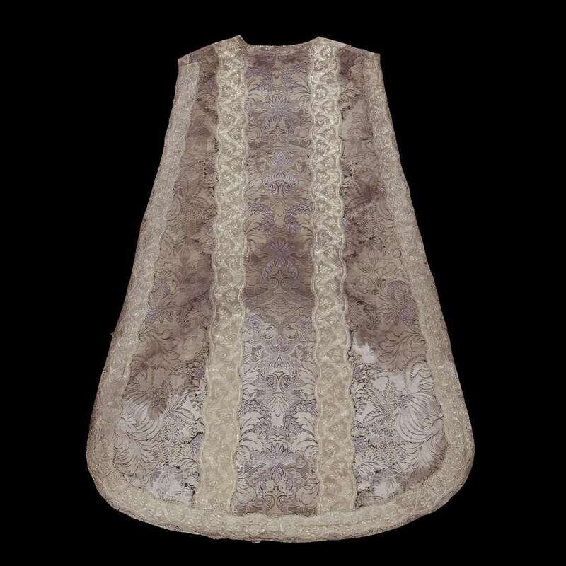 A FRENCH LACEWORK SILK CHASUBLE LINED IN BLACK STRIPED MOIRÉ SILK 18th century
