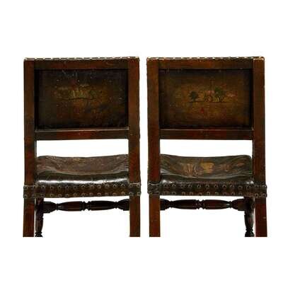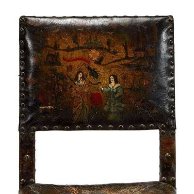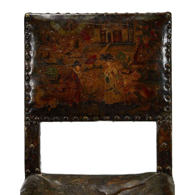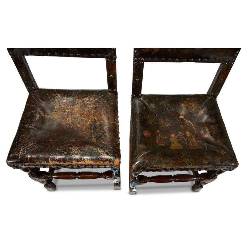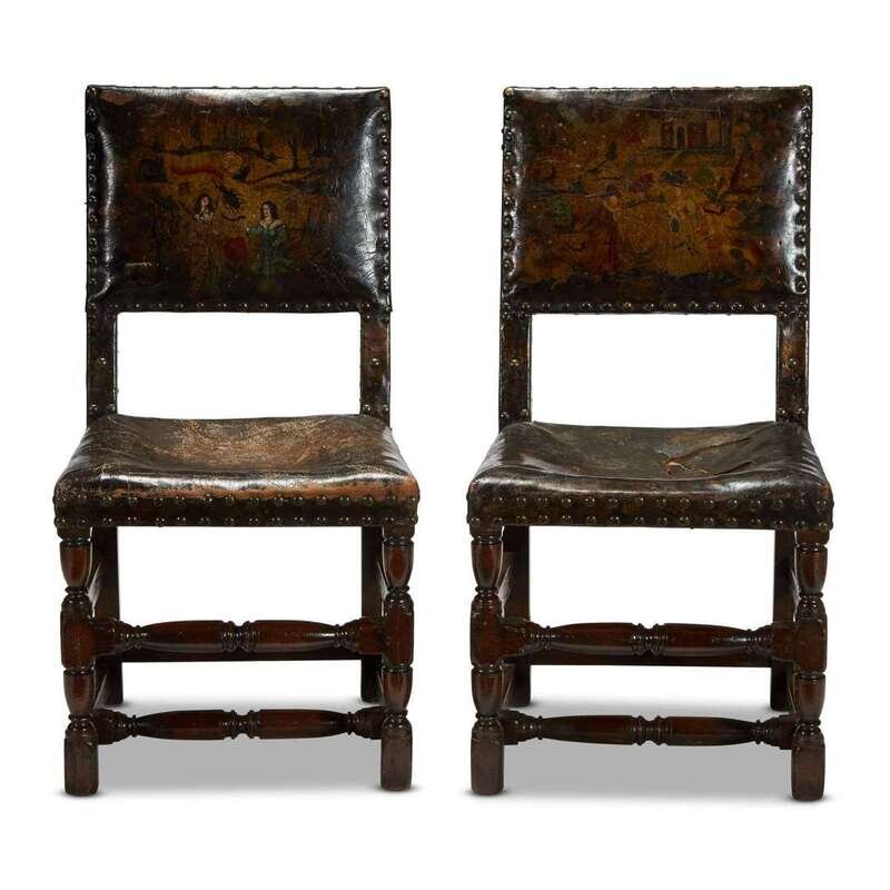 A RARE PAIR OF CHARLES II OAK AND POLYCHROME PAINTED CORDOVAN LEATHER CHAIRS 17th century