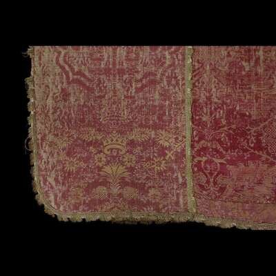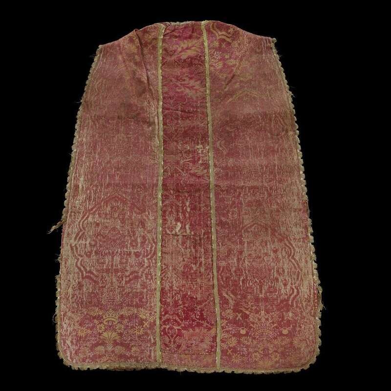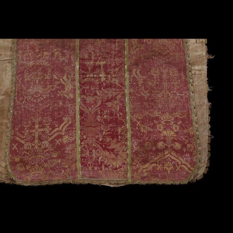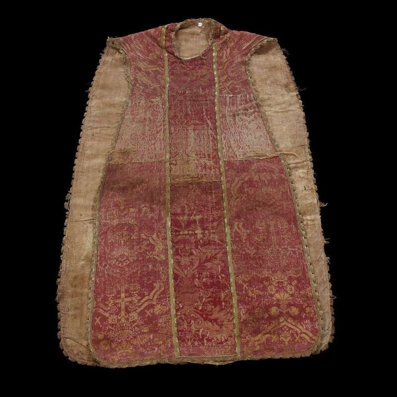 AN ITALIAN OR SPANISH RED AND GOLD SILK LAMPAS CHASUBLE mid 16th century