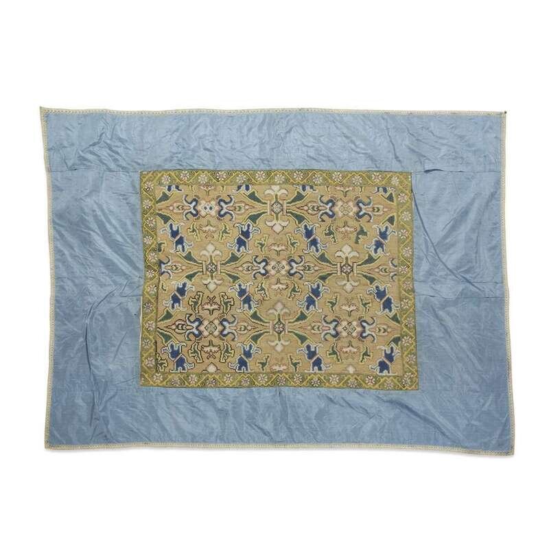 A SPANISH OR PERUVIAN PANEL, POSSIBLY A CUMBI, WITH BLUE SILK BORDER 18th century