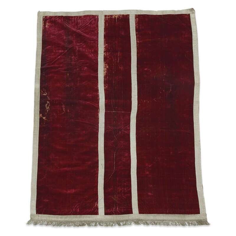 AN ITALIAN SILK VELVET DOOR HANGING WITH GOLD BRAID AND FRINGE 17th century