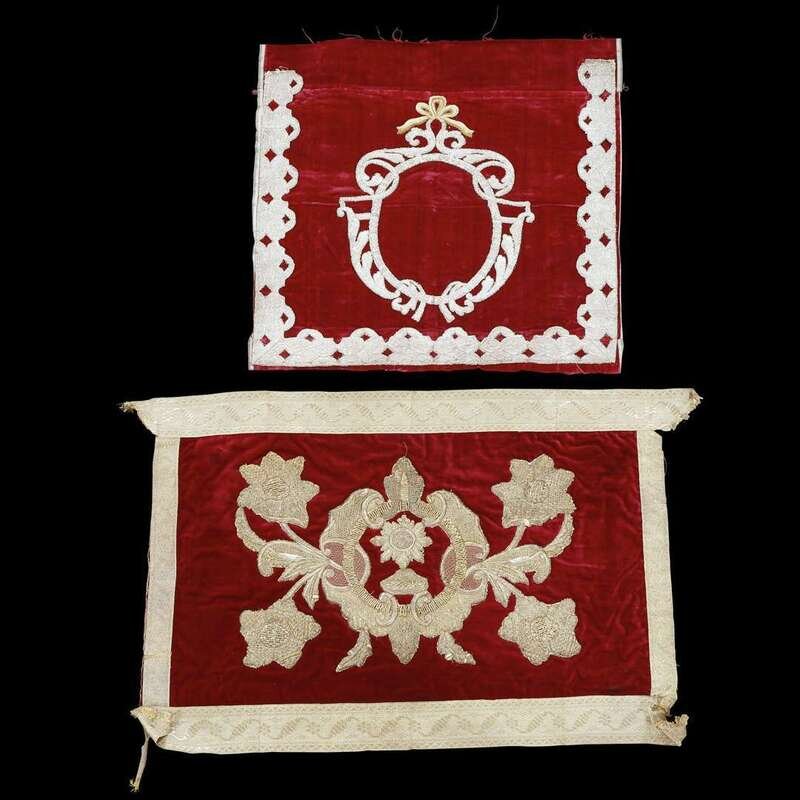 TWO SPANISH OR MEXICAN METAL THREAD EMBROIDERED SILK VELVET CUSHION COVERS 19th century