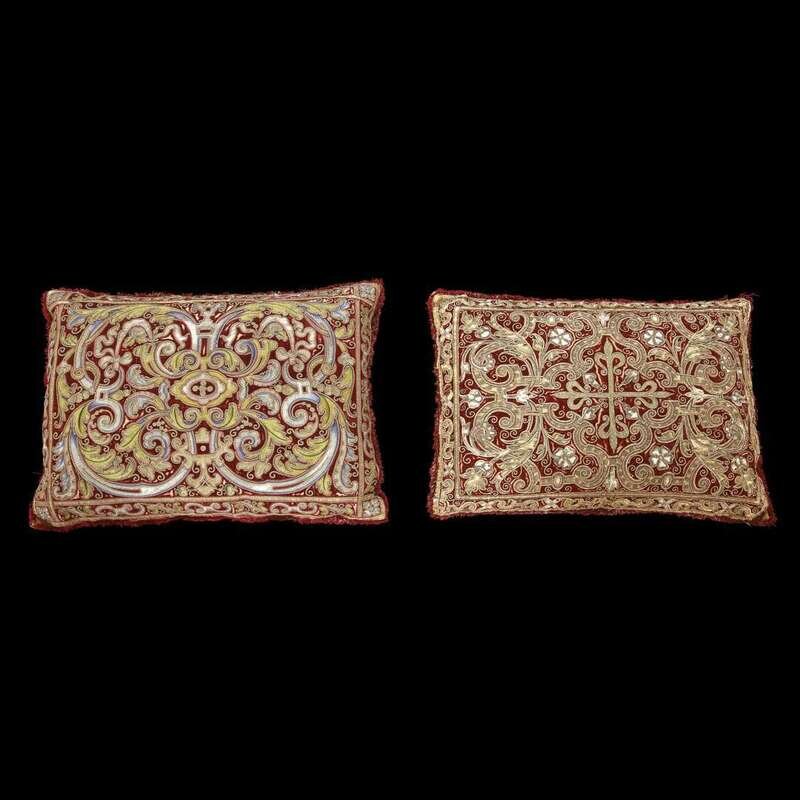 THREE SPANISH SILK AND METAL THREAD EMBROIDERED SILK VELVET CUSHIONS 17th/18th century