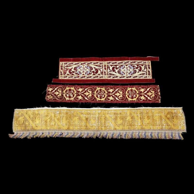 Comprising two silk and metal thread embroidered red velvet panels, and an Italian stamped gold velvet panel. (3).