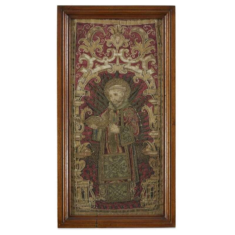 A SOUTH AMERICAN SILK, SILVER AND GOLD EMBROIDERED SILK AND VELVET PANEL late 16th/early 17th century