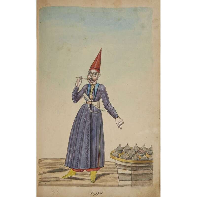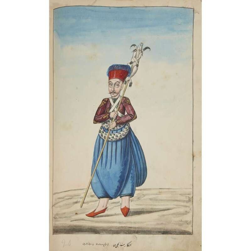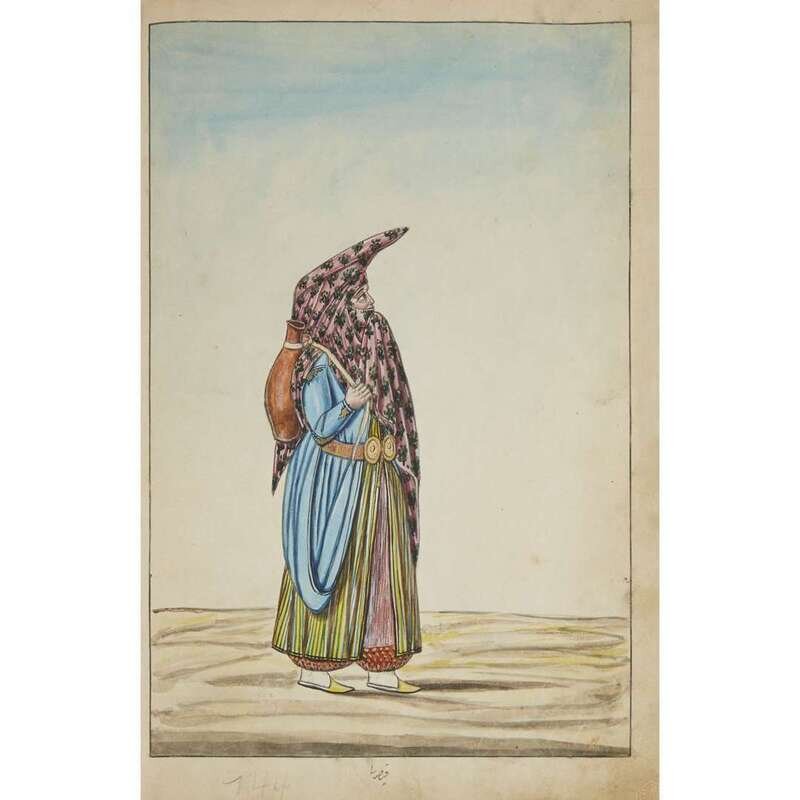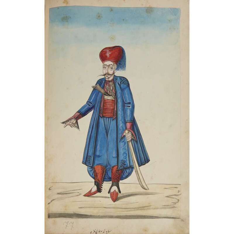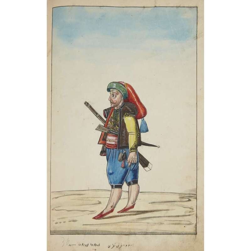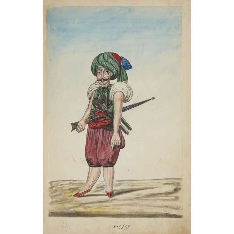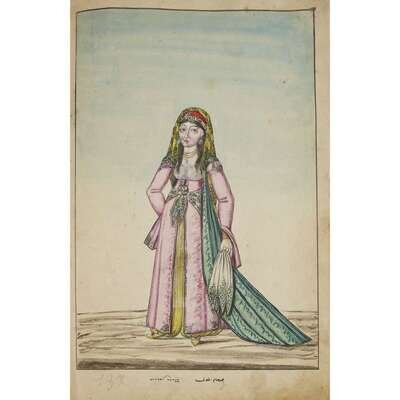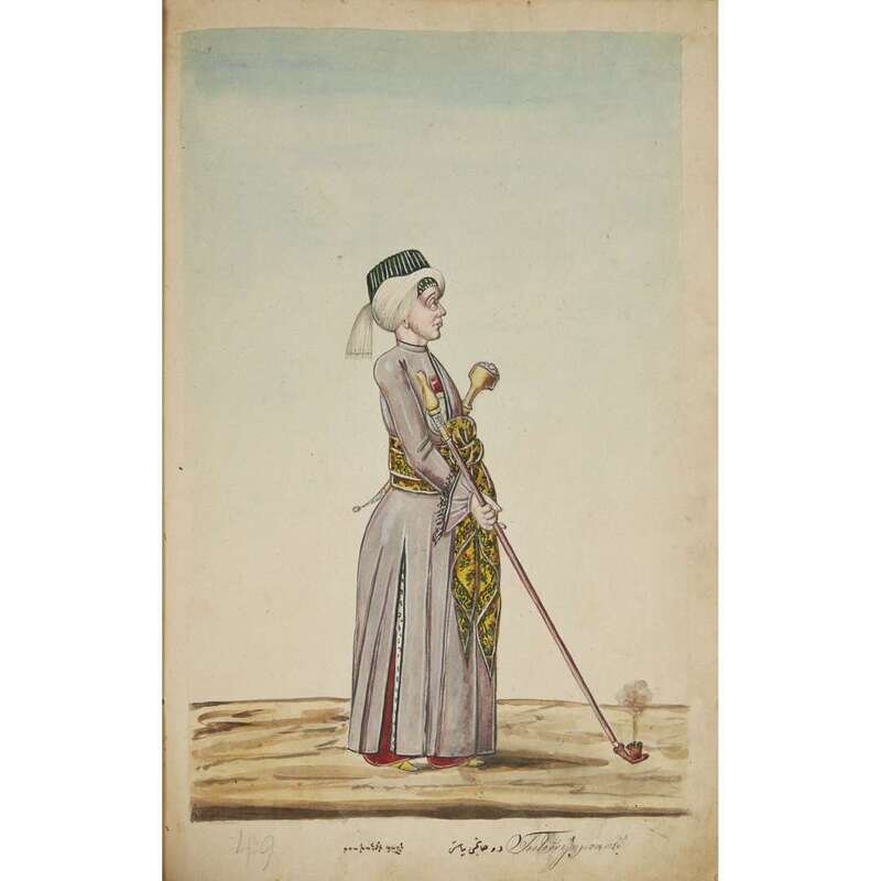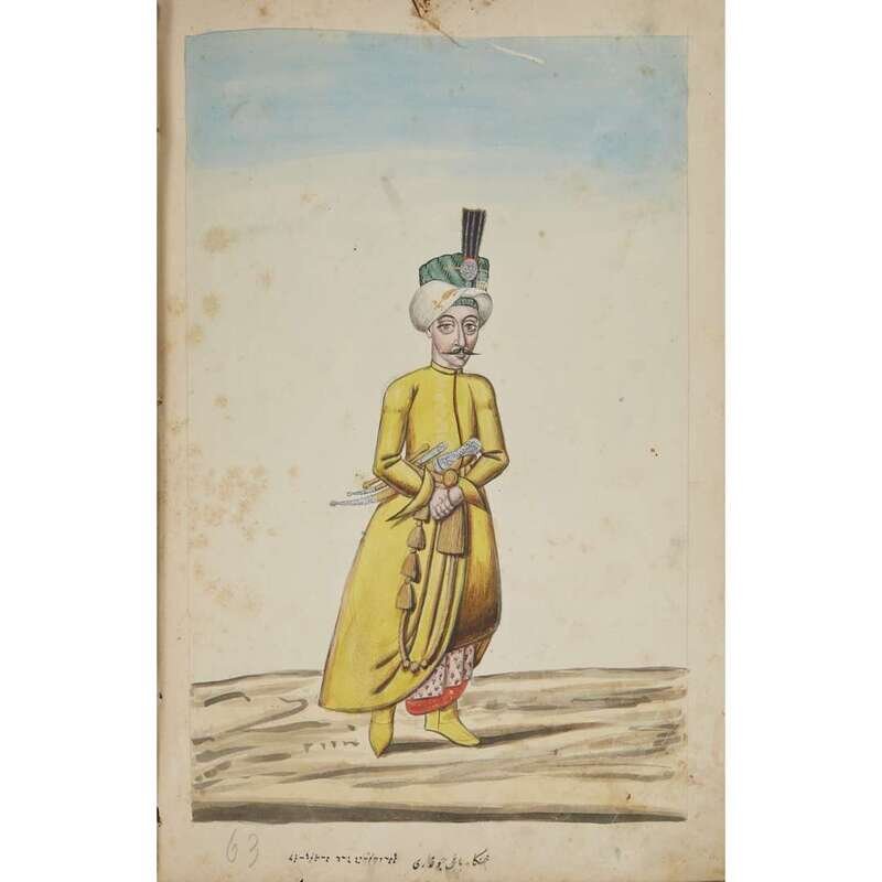 No place, no date (but likely Ottoman Empire, late 18th/early 19th century). Folio. Near contemporary binding of full brown leather, scuffed and rubbed; marbled endpapers, front free endpaper lacking, rear free endpaper disbound but present. Contains 148 original watercolors by a follower of Fenerci Mehmed depicting various types of native Ottoman dress-as well as a few other cultures-in a wide array of styles and colors, representing many of the various peoples inhabiting the Ottoman Empire. Approximately 82 heightened with gold, a few with silver. Most subjects in images identified in bottom margin (some also on recto) in between one to four languages including Ottoman Turkish, Hebrew, and Armenian. Ex-library with book-plate on front paste-down. A fascinating collection. Of the 148 individual watercolors, six are of women, one is of a horse in full livery, and the rest are of men of various social stations. Some views are from the rear, some include musical instruments or interiors, many feature accoutrement relevant to the costume or individual pictured. .