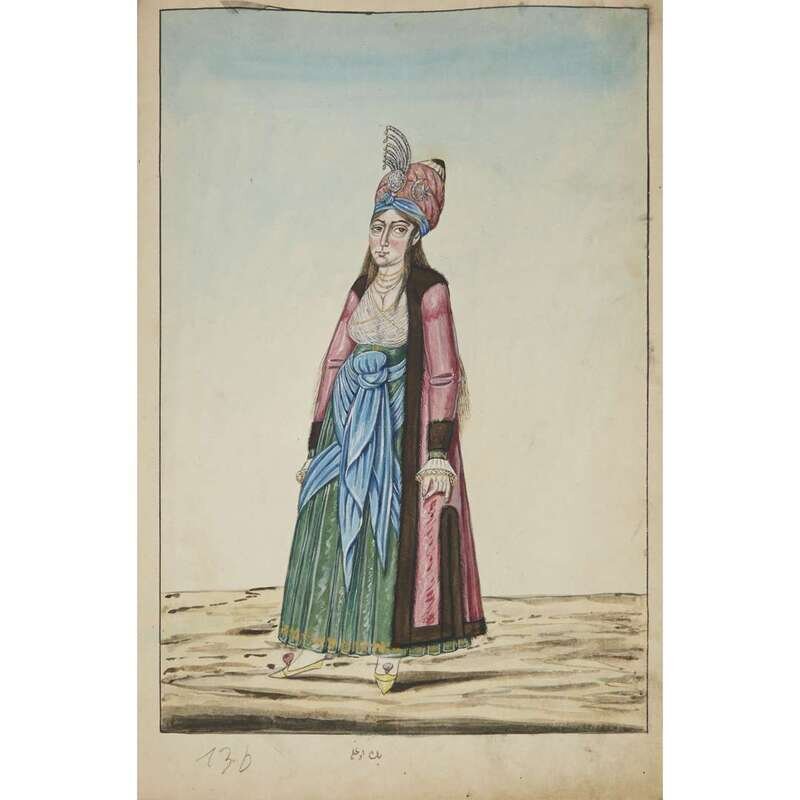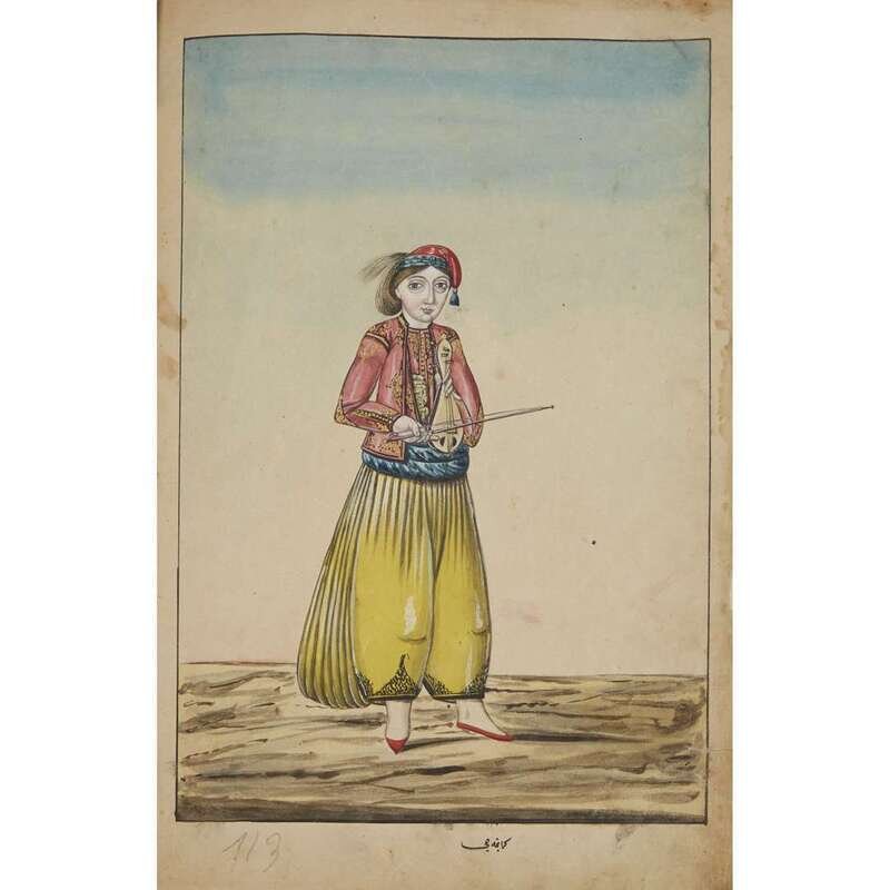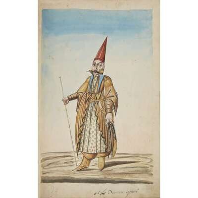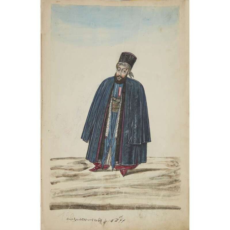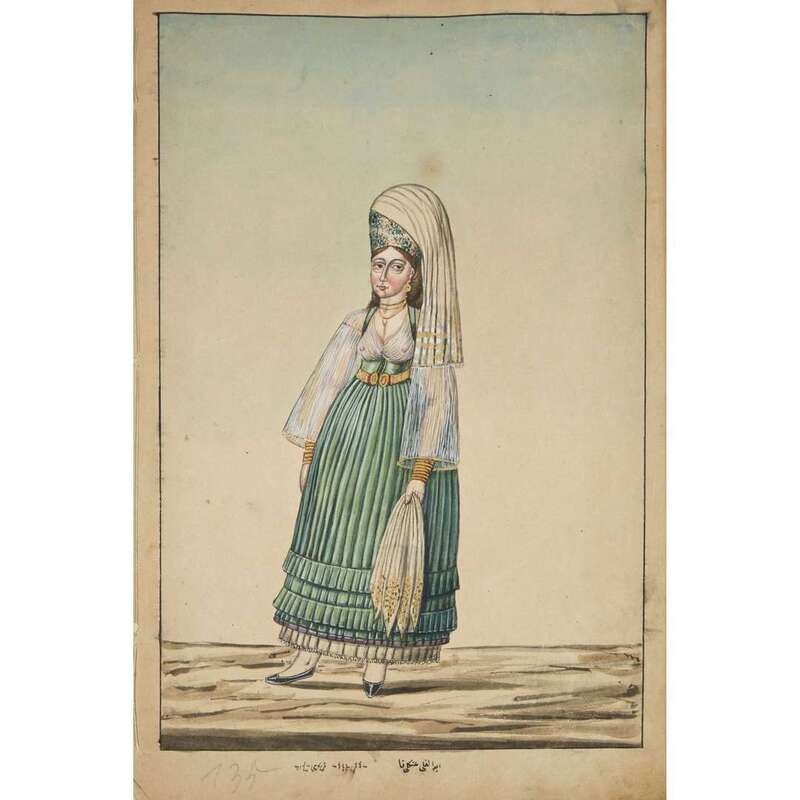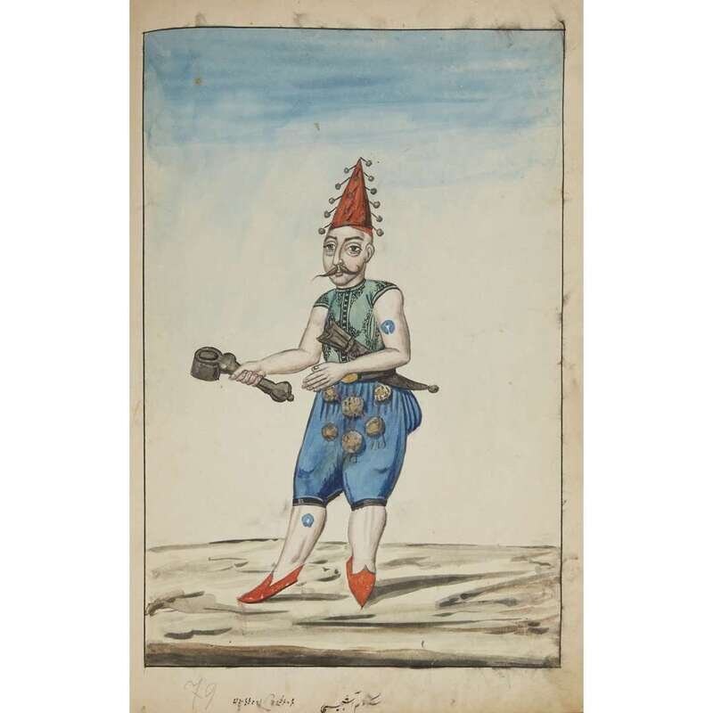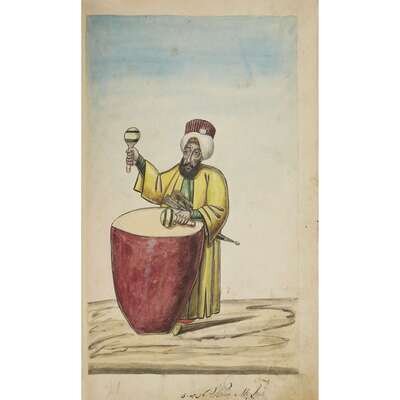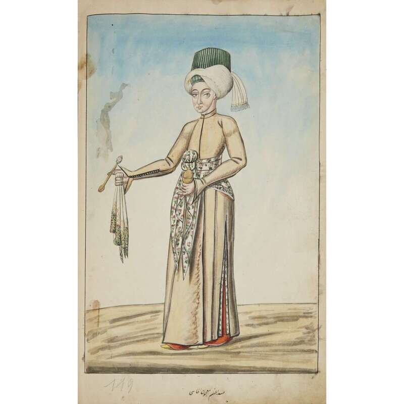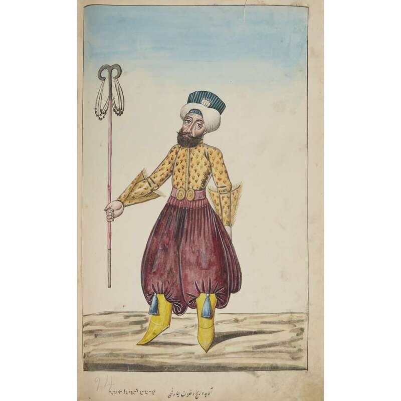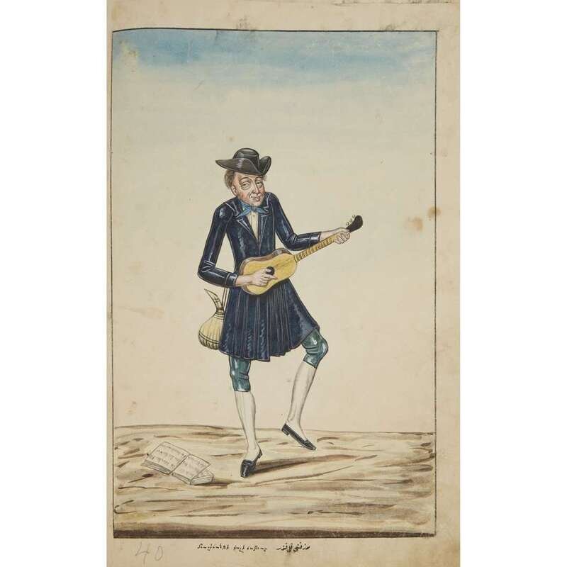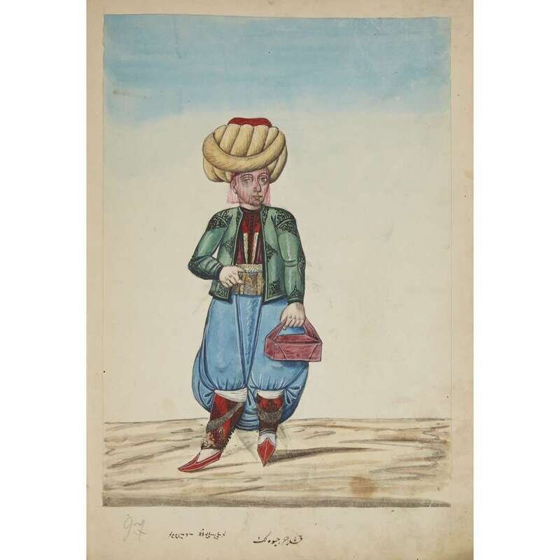 No place, no date (but likely Ottoman Empire, late 18th/early 19th century). Folio. Near contemporary binding of full brown leather, scuffed and rubbed; marbled endpapers, front free endpaper lacking, rear free endpaper disbound but present. Contains 148 original watercolors by a follower of Fenerci Mehmed depicting various types of native Ottoman dress-as well as a few other cultures-in a wide array of styles and colors, representing many of the various peoples inhabiting the Ottoman Empire. Approximately 82 heightened with gold, a few with silver. Most subjects in images identified in bottom margin (some also on recto) in between one to four languages including Ottoman Turkish, Hebrew, and Armenian. Ex-library with book-plate on front paste-down. A fascinating collection. Of the 148 individual watercolors, six are of women, one is of a horse in full livery, and the rest are of men of various social stations. Some views are from the rear, some include musical instruments or interiors, many feature accoutrement relevant to the costume or individual pictured. .