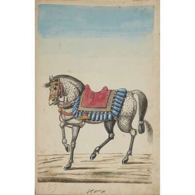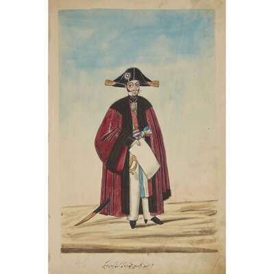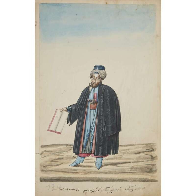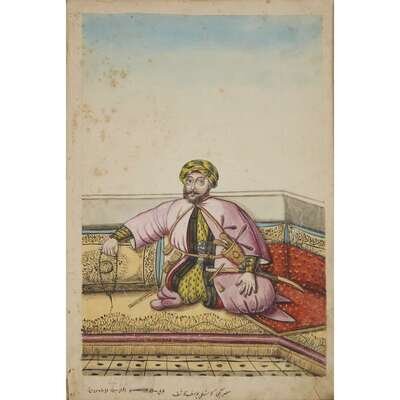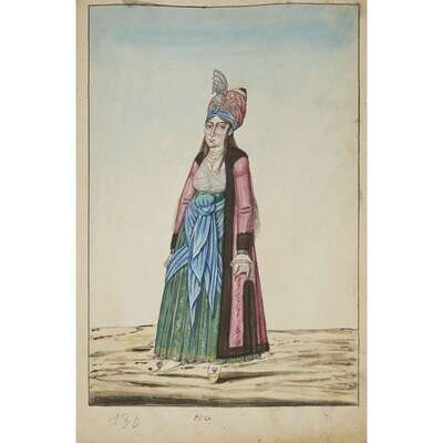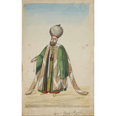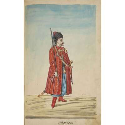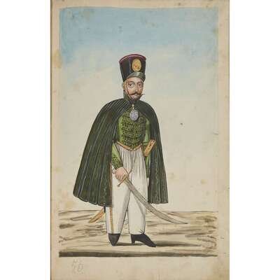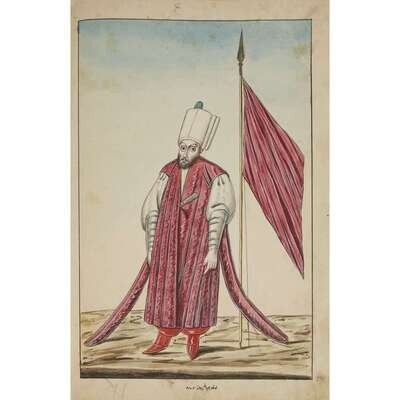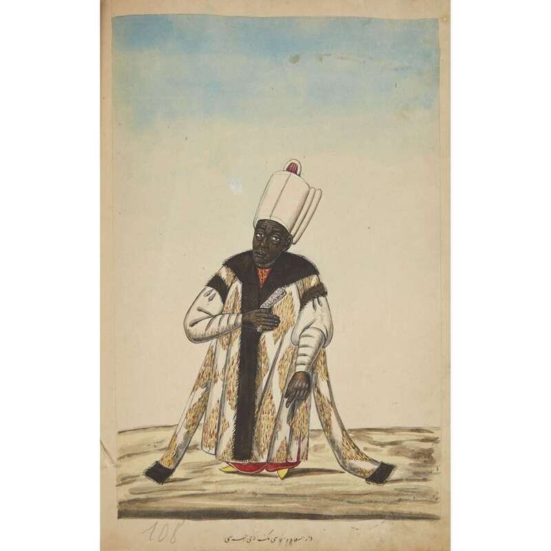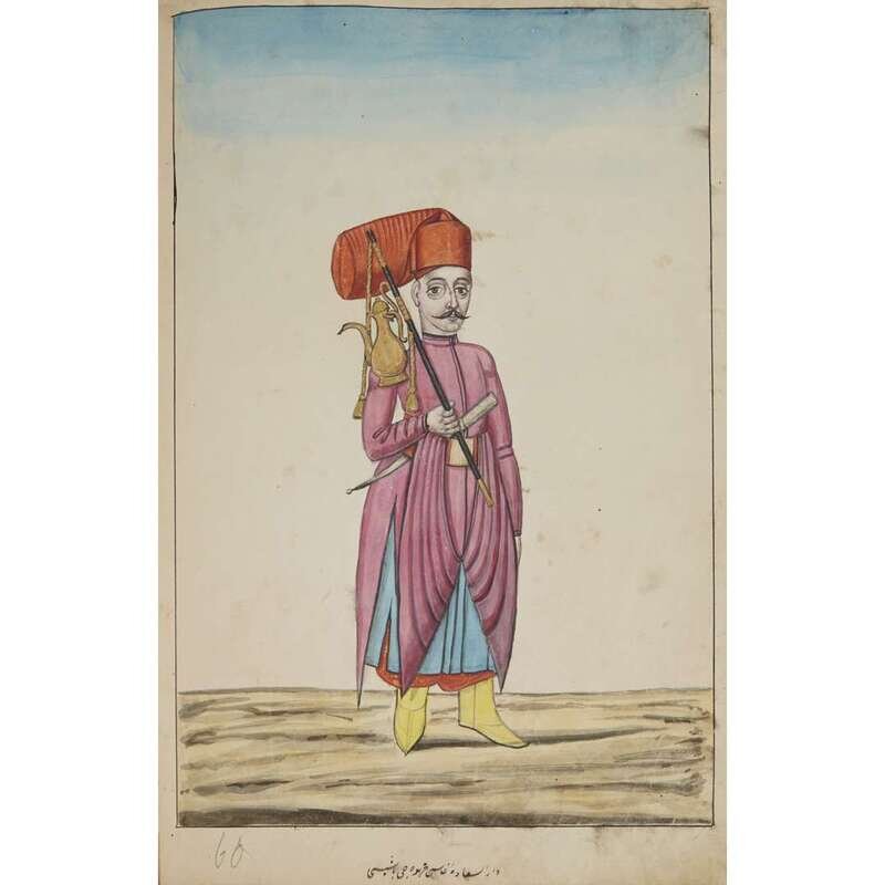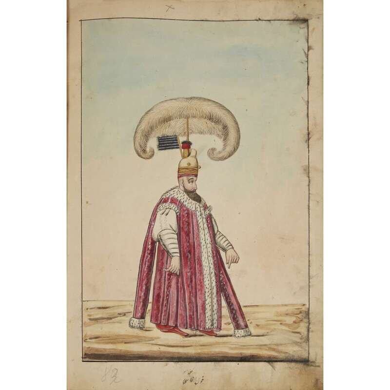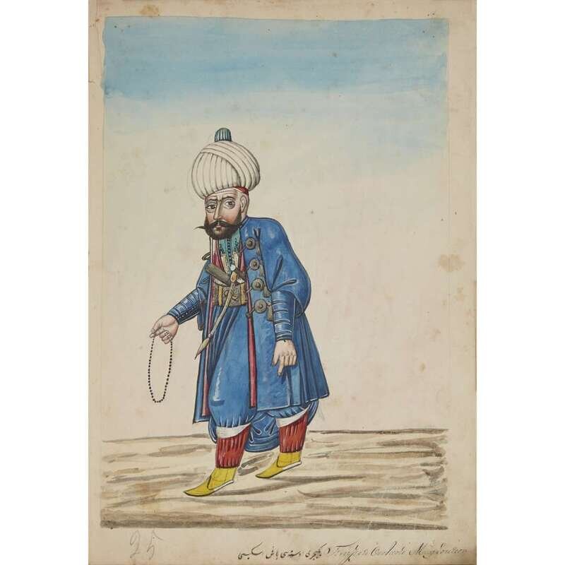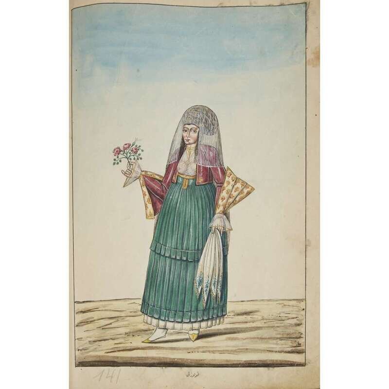 No place, no date (but likely Ottoman Empire, late 18th/early 19th century). Folio. Near contemporary binding of full brown leather, scuffed and rubbed; marbled endpapers, front free endpaper lacking, rear free endpaper disbound but present. Contains 148 original watercolors by a follower of Fenerci Mehmed depicting various types of native Ottoman dress-as well as a few other cultures-in a wide array of styles and colors, representing many of the various peoples inhabiting the Ottoman Empire. Approximately 82 heightened with gold, a few with silver. Most subjects in images identified in bottom margin (some also on recto) in between one to four languages including Ottoman Turkish, Hebrew, and Armenian. Ex-library with book-plate on front paste-down. A fascinating collection. Of the 148 individual watercolors, six are of women, one is of a horse in full livery, and the rest are of men of various social stations. Some views are from the rear, some include musical instruments or interiors, many feature accoutrement relevant to the costume or individual pictured. .