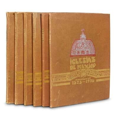 Mexico: Secretria de Hacienda, 1924-1927. First edition. In six volumes. Folio. Original color pictorial brown paper boards, paper spine labels; scuffed, joints and edges often rubbed. Numerous mounted half-tone photo plates, mounted color plates, plans, and illustrations in text. Scattered, mostly light, occasionally moderate foxing. Ex-library with ink stamps on front endpapers, pencil marking on title-page. Known for his photos of Mexican churches, Guillermo Kahlo is also known as the father of the painter Frida Kahlo.