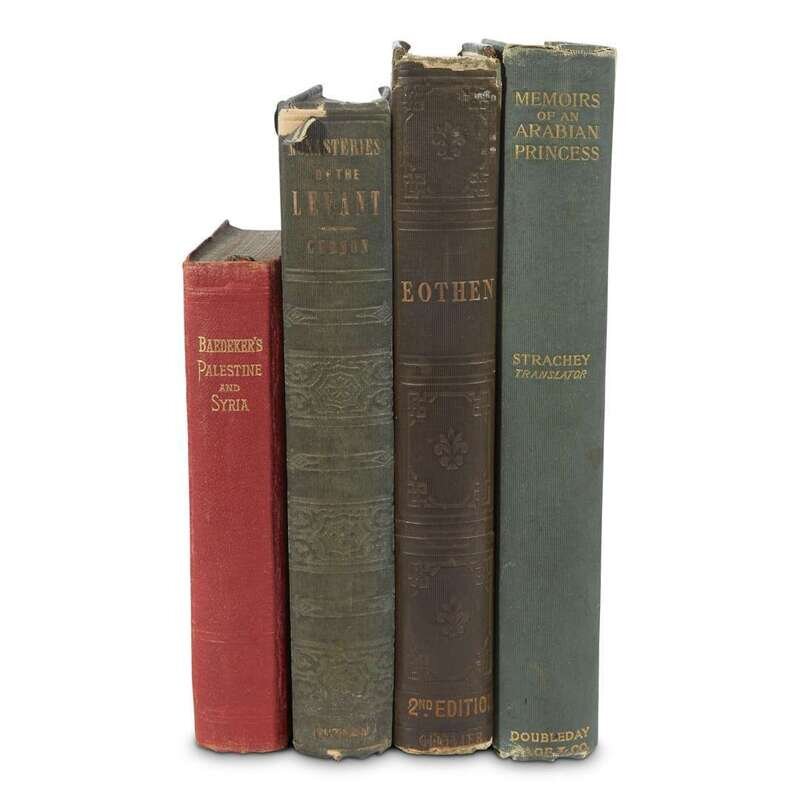 (Kinglake, Alexander William) Eothen, or Traces of Travel brought home From The East London: John Ollivier, 1845. Second edition. 8vo. (i)- xi, (i), (1)-418 pp. Original gilt-pictorial green cloth, untrimmed edges; corners bumped, back joint starting to fray, head and foot of spine frayed - loss to bottom blind rule. With folding color lithographic frontispiece (some wear and dust smudging at fore edge) and 1 color lithographic plate. Some minor internal dust smudging, some dust smudging to title-page, scattered foxing at back. Ex-library with pencil marking on title-page and head of p. (1). Abbey Travel 362. Curzon, Robert A Visit to the Monasteries in the Levant New York: Putnam, 1849. 12mo. Original gilt-pictorial green cloth, gilt-lettered spine, untrimmed edges; corners bumped, small chip at head of spine - no loss to gilt lettering. With frontispiece, title vignette, and 13 (of 15) plates [lacking Interior of an Abyssinian Library and Plan of the Church of the Holy Sepulcher, Jerusalem]. Light to moderate foxing at front, other scattered, mostly light, foxing. Ex-library with ink stamp on front paste-down, pencil marking on title-page, blue crayon marking on verso of title-page. (Ruete, Emily) Memoirs of an Arabian Princess New York: Doubleday, Page, 1907. Translated by Lionel Strachey. 8vo. Original gilt and silver pictorial green cloth, top edge gilt, other edges untrimmed; joints and extremities scuffed. With 32 plates, including frontispiece portrait and photo plates. Internally clean. Ex- library with label on front paste-down, pencil markings on title-page. Baedeker, Karl Palestine and Syria Leipzig; London; New York, 1912. Fifth edition. 24mo. Original gilt-lettered flexible red cloth. With 21 maps, 56 plans, and a panorama of Jerusalem. Tight, bright copy. Ink ownership stamp on front paste-down and half title-page. Ex-library with ink stamp on verso of front free endpaper, pencil markings on title-page.