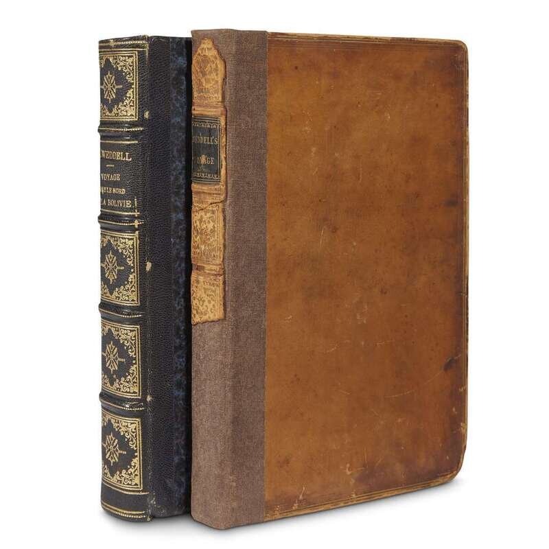 A Voyage Towards The South Pole... Containing an Examination of the Antarctic Sea... and a Visit to Tierra del Fuego… With a Particular Account of the inhabitants... Navigation of Cape Horn... London: Longman, Hurst, Rees, Orme, Brown, and Green, 1825. First edition. 8vo. Illustrated with six plates (two folding) - including a hand-colored frontispiece - and eight maps (six folding). Old calf, worn, crudely rebacked; hinges crudely repaired, with some offsetting, scattered foxing and spotting, dampstaining to the plates following pp. 34 and 44 and the intervening text leaves, moderate foxing to backs of folding plates, some darkening at edges of same and a few of the maps, lacking advertisements. Ex-library with book-plate on front paste-down and call number in pencil on title-page. Sabin, 103431; Rosove, 345A1. The first party to have wintered in the Antarctic regions. Weddell, H.A. Voyage dans Le Nord de la Bolivie et dans les parties voisines du Perou ou visite au district aurifere de Tipuani Paris and London: P. Bertrand and H. Bailliere, 1853. First edition. 8vo. With tinted lithographic frontispiece, one tinted lithographic plate, one folding map, 4 pp. of musical notations. Contemporary quarter black morocco over marbled paper-covered boards, spine gilt, minor wear except small blister at top edge of front cover; marbled endpapers; all edges speckled; moderate foxing to plates, title-page, front and back matter. Ex-library with book-plate on front paste-down and call number in pencil on same and on title-page. Regarded as one of the most significant 19th century voyages to South America.
