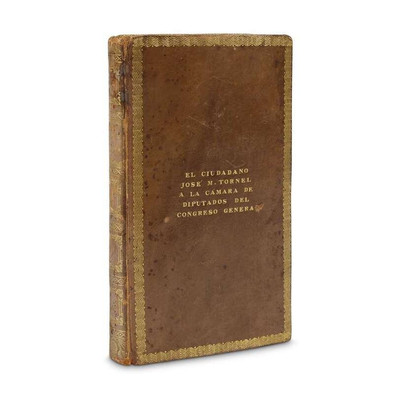 New York: For José Desnoues, 1831. First Spanish edition. 12mo. From the library of Mexican general and politician José M. Tornel, as indicated in lettered gilt on the front cover, "El Ciudadno / José M. Tornel / a la Cámara de / Diputados del / Congreso Genera…" Full gilt decorated calf; gilt foliate spine; marbled edges; dentelles gilt; marbled endpapers, by C. Brown. Lightly worn, joints lightly rubbed, spotting to front and rear boards, corners bumped, with a small abrasion to the gilt letters on front boards; with an ownership inscription in ink on recto of front blank, moderate toning to text, moderate foxing to same, occasionally dampstained. Ex-library with a call number in pencil on title-page. Sabin 36761. Diario Historico recounts the first hand experience of French explorer Henri Joutel (1643-1725) on his expedition with René-Robert Cavelier, Sieur de la Salle (1643-1687) throughout the Gulf region and Texas. Translated by José M. Tornel, former Mexican Ambassador to the United States from 1829-1831 and Mexican Minister of War; Tornel was an instrumental voice under first President of the United Mexican States Guadalupe Victoria, helping suppress the Fredonian Rebellion, the beginning of the Texas Revolution.