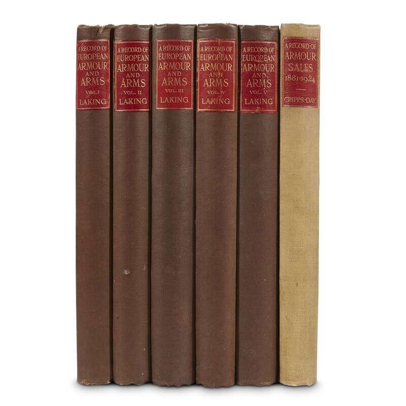 Laking, Guy Francis, Sir A Record of European Armour and Arms through Seven Centuries London: G. Bell and Sons, 1920-1922. First edition. In five volumes. 4to. Original tan cloth, red morocco spine labels, top edges gilt, other edges untrimmed; slightly sunned, moderate shelf wear. With frontispiece in volume 1, numerous other illustrations. Internally generally clean. All ex-library with labels on front paste-downs, pencil markings on title-pages. Cripps-Day, Francis Henry A Record of Armour Sales, 1881-1924 London: G. Bell and Sons, 1924. First edition. 4to. Original beige cloth, red morocco spine label, top edge gilt, other edges untrimmed; light to moderate shelf wear. Frontispiece, numerous other illustrations. Internally generally clean. Ex-library with labels on front paste-down, pencil markings on title-page.