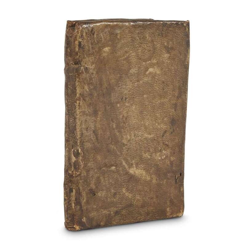 Antwerp: Christophe Plantin, 1585. 16mo. 87 pp. Facing Greek and Latin text. Old vellum over boards; trimmed. Darkened and scuffed; underscoring in old ink to text, closely trimmed at head and feet of leaves with a few words lost, bottom fore-edge corner of leaf A3 torn away with loss to printing. Adams E-227.