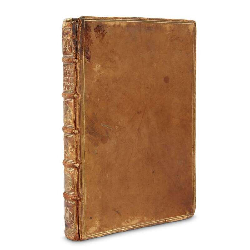 Venice: Giorgio Hertz, 1654. 4to. [4 leaves], 1-368, (2), (8) pp. With a half title-page and an additional engraved vignette title-page, head pieces, and decorated initials. Full contemporary tan calf. With an armorial device in spine compartments, presumably of Nicolas Fouquet (1615-1680), Superintendent of Finances in France under Louis XIV. Italic and Roman type, with letterpress shoulder notes. Scuffed, joints and extremities rubbed, with the head of spine rubbed away and the headband exposed; light foxing to title-page, front and rear leaves, some darkening at edges to front and rear, internally generally clean. Ex-library with book-plate on front paste-down, an ink stamp on half-title and rear paste-down, and call number in pencil on front paste-down and title-page.