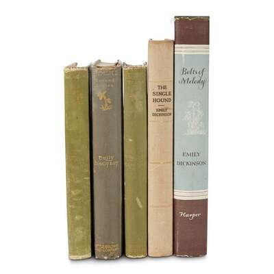 Poems Boston: Roberts Brothers, 1896. Fifteenth edition. 12mo. 152 pp. White cloth with green cloth spine; lettered in gilt; all edges gilt. Worn, corners bumped, slightly soiled, dampstained at bottom, hinge starting to crack; lightly toned, scattered notation in pencil, ownership marking in ink on front free end-paper. Ex-library with book-plate and stamp on front paste-down and call number in pencil on title-page. Poems. Third Series Boston: Roberts Brothers, 1896. First edition. 12mo. 200 pp. White cloth with green cloth spine; lettered in gilt. Worn, slightly soiled, dampstained, corners bumped; prelims heavily toned, text lightly toned, scattered occasional notation in pencil, ownership marking in ink on front free endpaper. Ex-library with book-plate and stamp on front paste-down and call number in pencil on title-page. BAL 4661. Poems. Second Series Boston: Little, Brown, and Company, 1910. Reprint. 12mo. Gray cloth; lettered in gilt; beveled edge; top edge gilt. Lightly worn, corners bumped, lightly soiled, edges foxed; prelims at times heavily toned, scattered foxing to text, occasional notation in pencil, ownership marking in ink on front free endpaper. Ex-library with book-plate and stamp on front paste-down and call number in pencil on title-page. The Single Hound. Poems of a Lifetime Boston: Little, Brown, and Company, 1914. First edition. 12 mo. White paper boards over white cloth; edges untrimmed. Worn, toned, corners slightly bumped; bookshop catalogue description mounted on front free endpaper, very lightly toned at margins. Ex-library with book-plate and call number in pencil on front paste-down, call number in pencil on title-page. [Todd, Mabel Loomis and Millicent Todd Bingham, editors] Bolts of Melody. New Poems of Emily Dickinson New York and London: Harper & Brothers Publishers, 1945. First edition. 12 mo. Blue and red dust-jacket; green cloth. Dust-jacket worn, slightly foxed, small closed tears to top and bottom, flaps worns; toning and light foxing to prelims, ownership signature in pencil on front paste-down. Ex-library with book-plate and call number in pencil on front paste-down, call number in pencil on title-page. Included with these volumes is ephemera of various sorts, including multiple newspaper clippings relating to Dickinson, a small invitation from the Grolier Club in New York dated October 18, 1945 advertising to its members an exhibition of material relating to Dickinson, card catalogue index cards, as well as a locket of hair from a Patty Athens dated 1915.