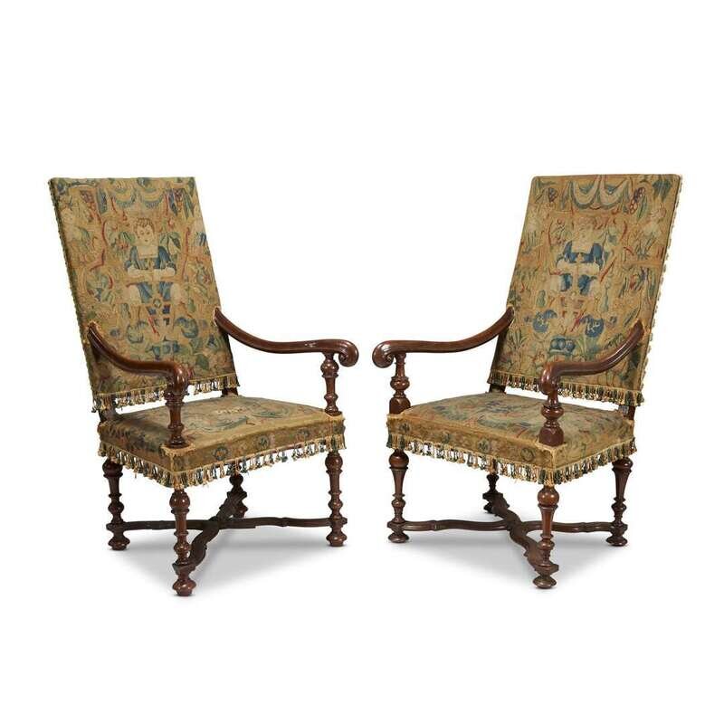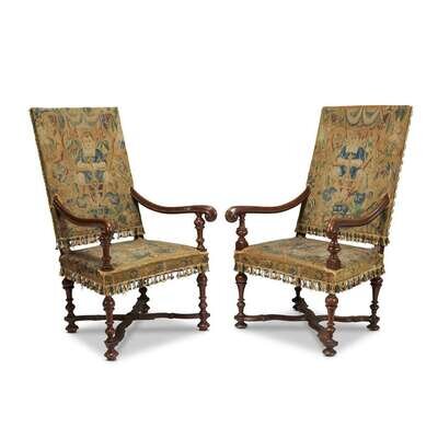 With 17th century Spanish tapestry upholstery, the chair backs upholstered in 18th century Italian damask depicting St. Lucy. (2).