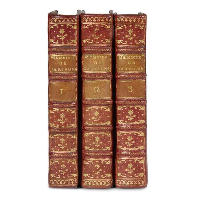 Cologne: Pierre Marteau, 1700. In three volumes. 12mo, 158 x 89 mm; 156 x 88 mm; 155 x 90 mm. (1)-440; (1)-497; (1)-498 pp. Title-pages in red and black, with an armillary sphere device. Late 18th century Russian Imperial full gilt penelled red morocco; gilt armorial crest in at center of each cover; gilt spine compartments; olive morocco spine labels; raised bands; all edges gilt; inner dentelles gilt; marbled endpapers. Lightly worn, two small worm holes near the front joints of the second and third volume; scattered light foxing to text. Ex-library with book-plates of Pavlovsk Palace Library and the Library of Virginia House, Richmon on front paste-downs and call numbers in pencil on verso of front free endpaper and title-pages. The gilt arms on each cover are likely those of the "Arms of Alliance," with the state arms of Russia at center, the arms of Schleswig-Holstein at left and those of Württemberg at right. These are the joint arms of Emperor Paul I and Empress Maris Feodorovna as heirs presumptive, ca. 1778-1789. This text served as a model for Alexandre Dumas pere's Three Musketeers. Imagine the future czar and czarina indulging their nostalgia for the ancien régime on the eve of the Napoleonic wars.