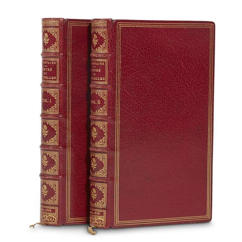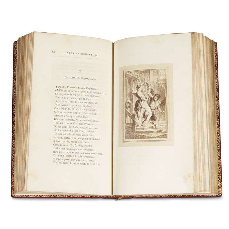 Paris: Alphonse Lemerre, 1868. In two volumes. Out-of-series copy, 1/116 (of 171). 12mo. With frontispiece portrait, 77 engraved appliqué plates, many of erotic subjects, but lacking the appliqué frontispiece in the second volume. Contemporary full gilt paneled brick red crushed morocco, richly gilt foliate spine compartments, raised bands, inner dentelles gilt, all edges gilt, marbled endpapers. Lightly worn; ownership signature in ink on front blank, small stains to prelims, some foxing to same, light foxing to text, otherwise bright and attractive bindings. Ex-library with book-plates on front paste-downs, all numbers in pencil on verso of front free endpaper and title-pages.