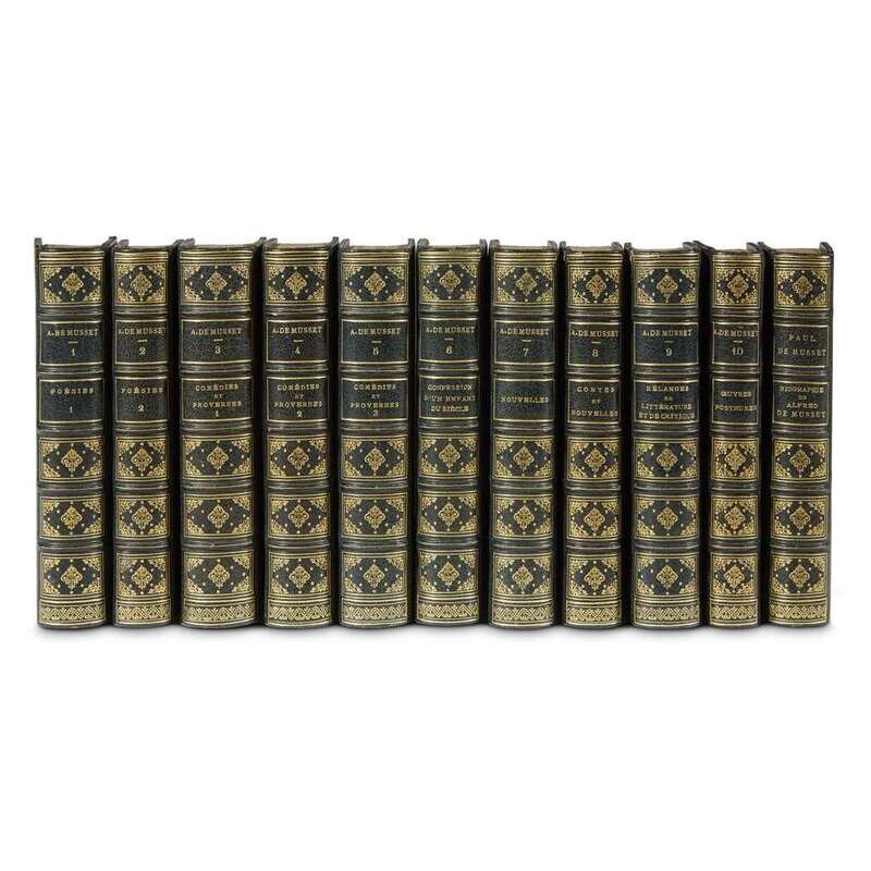 Oeuvres Paris: Alphonse Lemerre, 1876. In ten volumes. Small 8vo. Illustrated throughout with etched plates. All printed on laid paper, all internally clean, ink ownership on front blanks. Bound in full early 20th century navy blue crushed levant with decorative gilt tooling; marbled endpapers; all edges gilt, by Petit & Trioullier. Ex-library with call number in pencil on verso of first free leaf and on title-page in each volume. Musset, Paul de Biographie de Alfred de Musset Paris: Alphonse Lemerre, 1877. Small 8vo. With frontispiece portrait. Printed on laid paper, internally clean, ink ownership on front blank. Bound in full early 20th century navy blue crushed levant with decorative gilt tooling; marbled endpapers; all edges gilt, by Petit & Trioullier. Ex-library with call number in pencil on verso of first free leaf and on title-page.