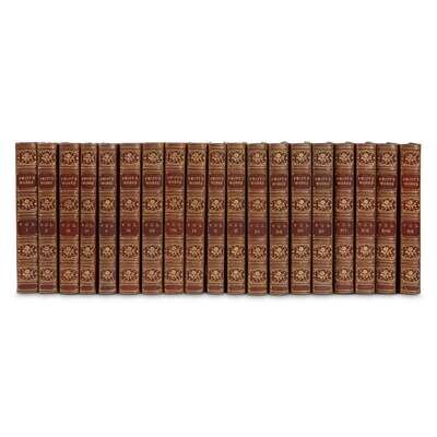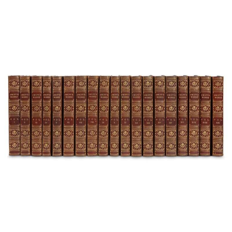 Edinburgh: Archibald Constable and Co., 1824. In 19 volumes. Second edition. With an engraved frontispiece portrait of Swift in the first volume. Later three-quarter burgundy morocco over red linen, foliate spine compartments in gilt, raised bands, top edges gilt, others trimmed, marbled endpapers. Boards very lightly worn, joints occasionally worn, corners occasionally bumped; text very lightly toned and occasionally lightly foxed. Ex-library with book-plates on paste-downs, call numbers in pencil on title-pages, and occasional pencil markings on prelims.