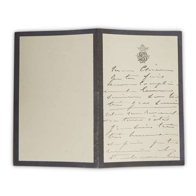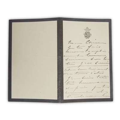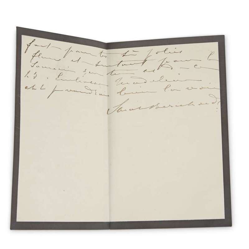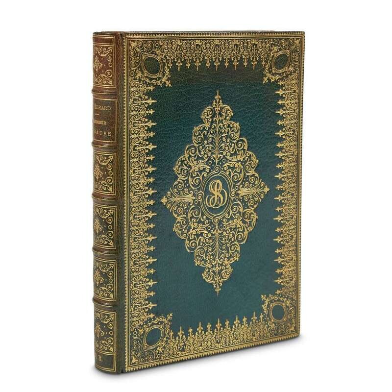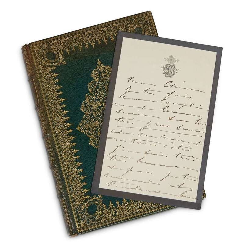 Paris: Librairie Hachette, 1870. First edition. 12mo. From the library of legendary French stage actress Sarah Bernhardt. Presentation copy to Bernhardt, inscribed and signed by the author on front blank, "A Mademoiselle Sarah Bernhardt / hommage d'un admirateur fervent / Stephan Liegeard." With an autograph letter, signed by Bernhardt on her mourning stationary laid in at front; folded 12mo, 2 pp. Original June 1923 auction catalogue description tipped in at front, original lot number mounted to same. Full contemporary richly gilt green morocco; richly gilt spine compartments; with Bernhardt's monogram in gilt at center of front cover; her initials at foot of spine; inner dentelles gilt; all edges gilt; green silk moire endpapers; by Adriaensen. Light discoloration to head of spine; internally clean. Ex-library with a call number in pencil on title-page.