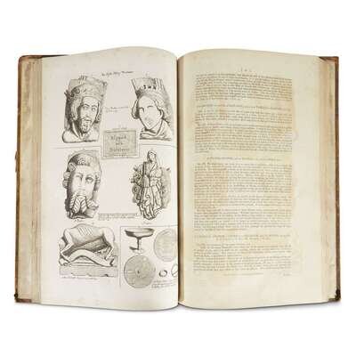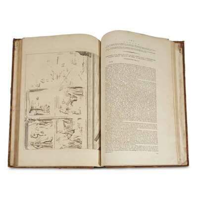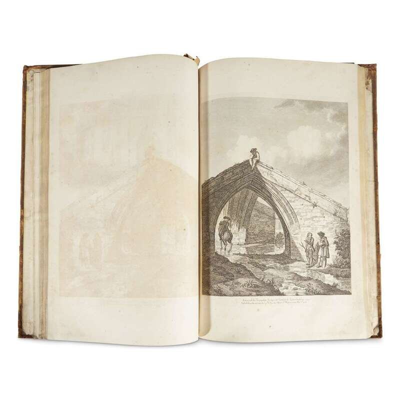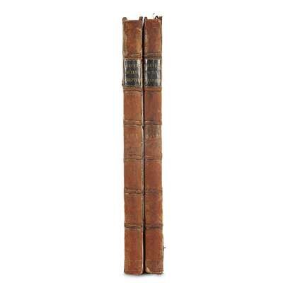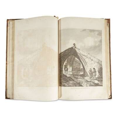 London: John Carter, 1780-87. In two volumes. First edition. Tall folio. 130 pp. (60 pp. in first volume, 70 in second volume). With engraved frontispiece in each volume. Illustrated engraved title-page in each. Dedication page, subscriber's list and index in each. Original Priestley & Weale bookseller catalogue tipped in at front of first volume. Illustrated with 115 engraved plates, including four foldout plates and 32 hand-colored. Full contemporary tree calf; rebacked spine; raised bands; edges trimmed and stained yellow. Worn, edges and joints rubbed, corners bumped, horizontal scar to the front board of the first volume, small abrasions to front and back boards, front boards of the first volume starting to separate; toning and foxing to text and plates, plates off-setting onto text, closed tear to plate 43, "The head of Crosier at large" in the first volume, faint owners signature in pencil at the front of the first volume. Ex-library with book-plates on paste-down and call numbers in pencil on title-pages of each volume.