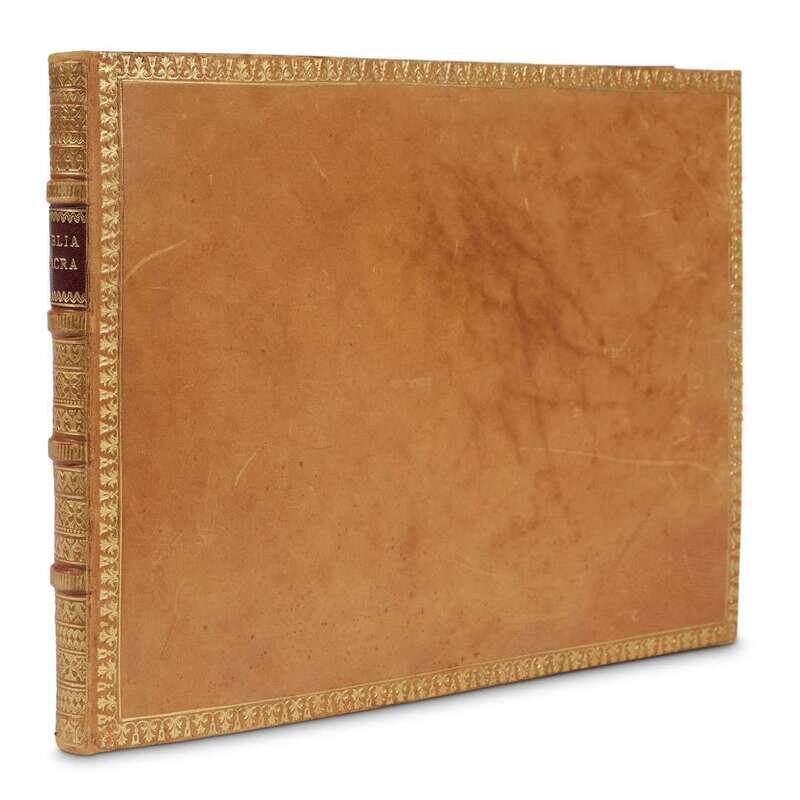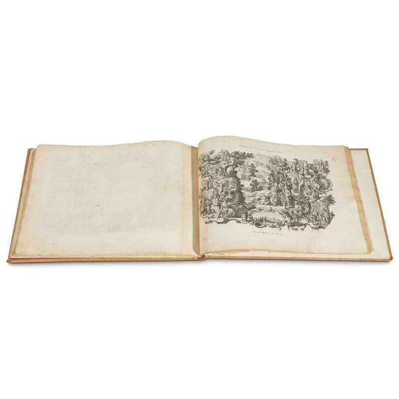 [Augsberg], [c. 1750]. Oblong 4to. Illustrated with 96 engravings (of 100). Later full light brown crushed morocco; floral border in gilt; decorative spine in gilt; raised bands; dentelles in gilt; silk floral endpapers. Boards slightly scuffed, light abrasions to boards, light spotting, bottom corners bumped; plates varying degrees of soiling to plates, repairs present to edges and corners, chipping and small papers losses to edges and corners, paper loss with repair to plate 79, affecting image area. [University Library of Augsburg].