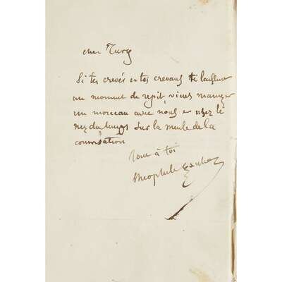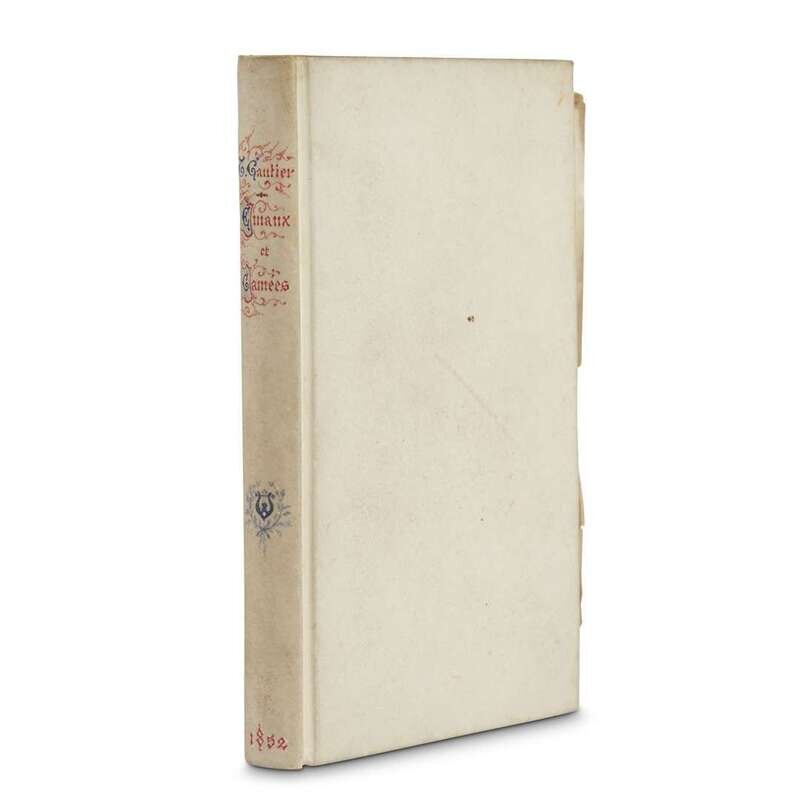 Paris: Eugene Didier, 1852. First edition, ordinary paper issue. 18mo (150 x 94 mm). (4), (1)-106, (2) pp. With an autograph letter, signed and inscribed by Gautier to an unnamed correspondent, inviting the receipient in playfully arresting and vernacular French to dine and converse. Mounted by blank integral to the front free endpaper. With the book-plate of Joly-Bavolliot on front paste-down. Complete, with half title-page. Later cream boards; spine lettered in red and black; original printed wrappers; untrimmed. Wrappers with small areas of light wear, spine panel not preserved; 20th century ownership signature in ink on front binder's blank, internally clean. Ex-library with book-plate on front paste-down and call number in pencil on title-page. Attractive copy of this influential landmark of French verse.