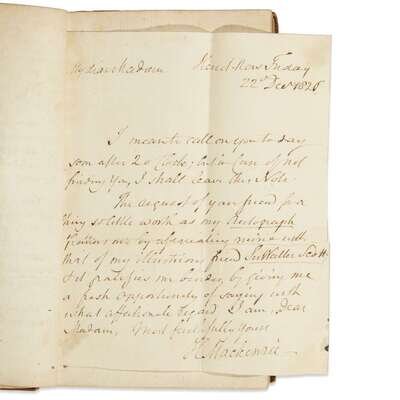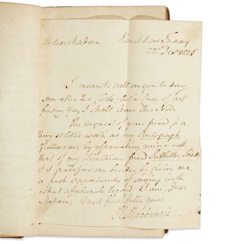 London: for T. Cadell, 1771. First edition. 12mo. With a Henry Mackenzie autograph letter, signed H. Mackenzie and dated Dec. 22, 1826, tipped in at front: "Dear Madam, I meant to call on you today... The request of your friend for a thing of so little worth as my autograph flatters me... with that of my illustrious friend Sir Walter Scott..." Early ink ownership on verso of front free endpaper. Full contemporary tan calf. Boards and joints rubbed, front board starting to separate, corners bumped; some occasional foxing to text, with some small ink stains in margins of a few leaves. Ex-library with book-plate on front paste-down and call number in pencil on the same and the title-page, as well as an ink stamp on back paste-down. Henry Mackenzie (Scottish, 1745-1831), was a leading member of the Edinburgh literary scene, Comptroller of taxes for Scotland, as well as a lawyer.